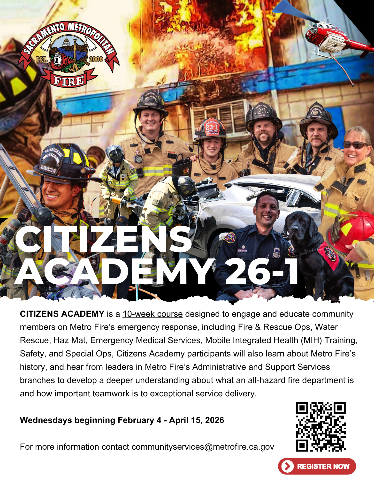 The Sacramento Metropolitan Fire District is excited to invite community members, business owners, public figures, and government officials to participate in our upcoming "Metro Fire Citizens Academy." This engaging 9-week course provides a fantastic opportunity to gain a comprehensive understanding of Metro Fire’s emergency response operations.